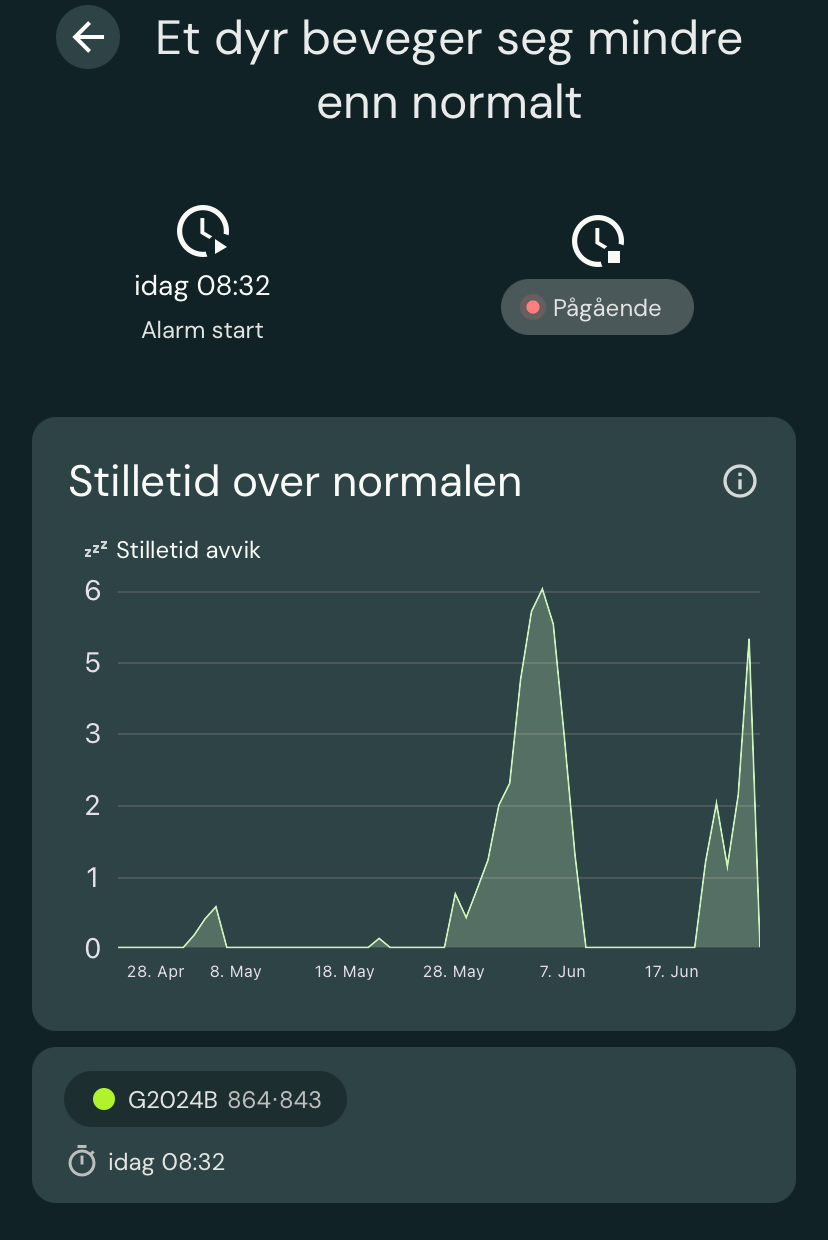 Du får nå varsel dersom ett dyrs aktivitetsnivå plutselig øker sammenlignet med det normale for akkurat det dyret. Vi sammenligner aktiviteten de siste tre dagene for å se etter endringer i dyrets daglige mønster. Slike endringer kan tyde på brunst.
