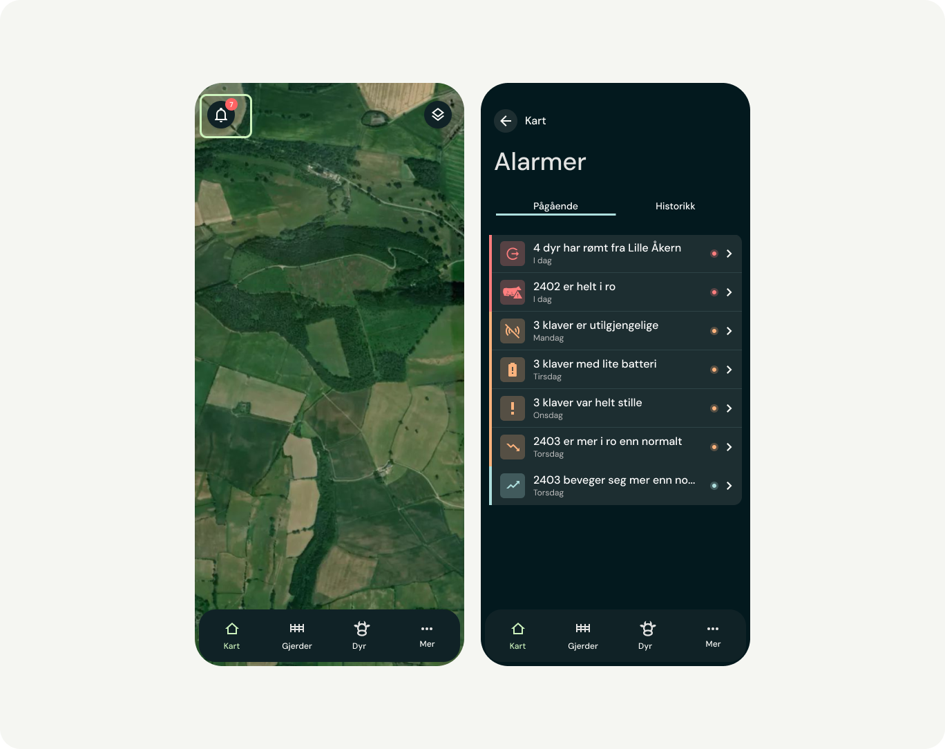 Det finnes flere ulike alarmer i Monilappen. Det er kun to alarmer du vil få en varsling om på din mobil: ved rømming og dersom et dyr sitter fast. Alle andre alarmer finner du når du går inn i appen din.