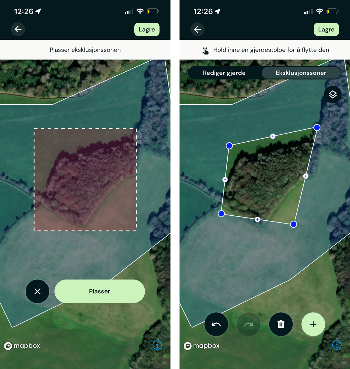 Eksklusjonsområder er områder i gjerdet ditt som du ikke ønsker at dyra skal gå. Som for eksempel: