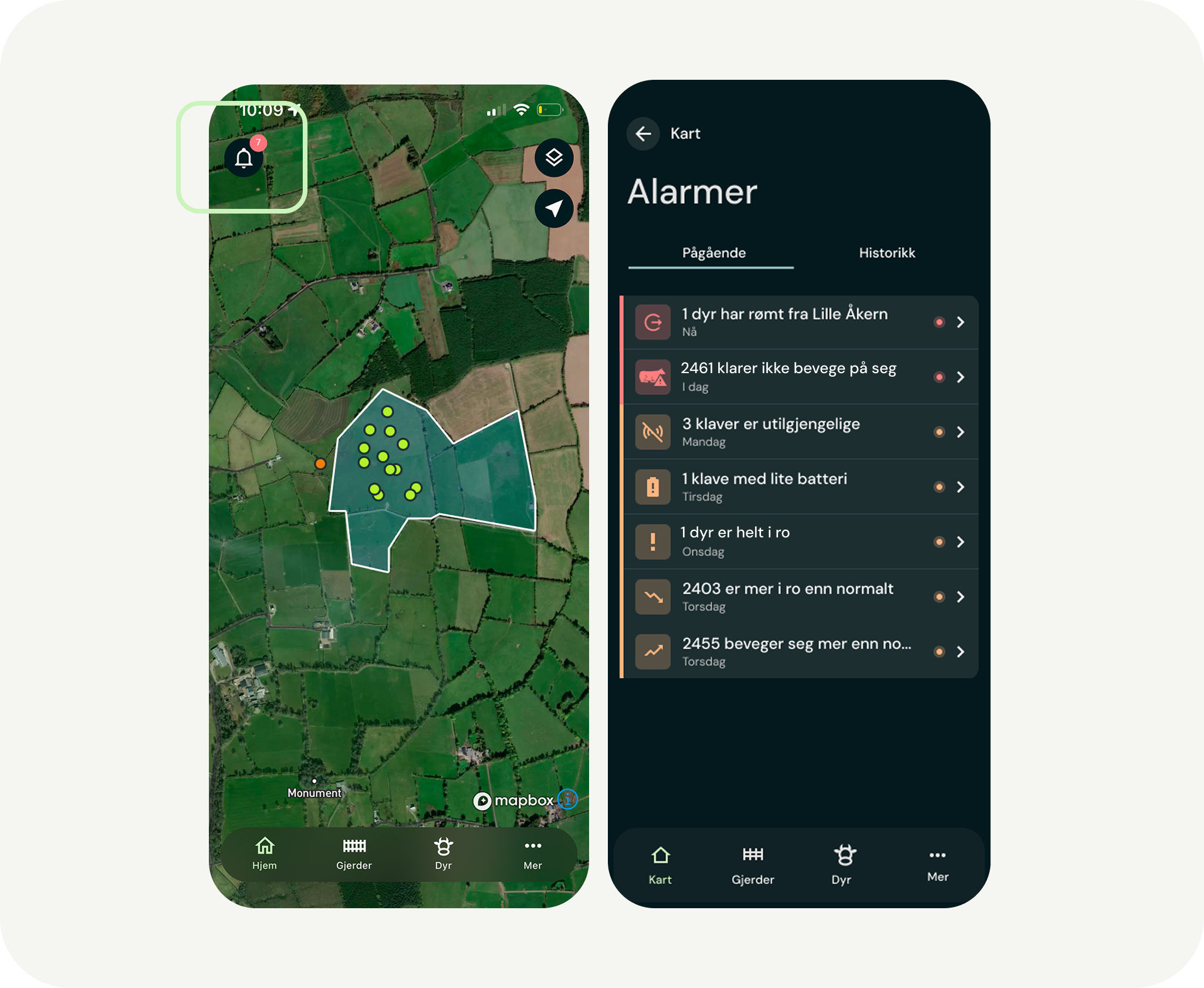 Monil-appen hjelper deg å holde oversikt over dyrene dine ved å overvåke aktivitet, posisjon og klavens status. Når noe avviker fra normalen, får du varsler direkte i appen. Du finner alle alarmer under Hjem → Alarmikonet øverst til venstre i kartet.