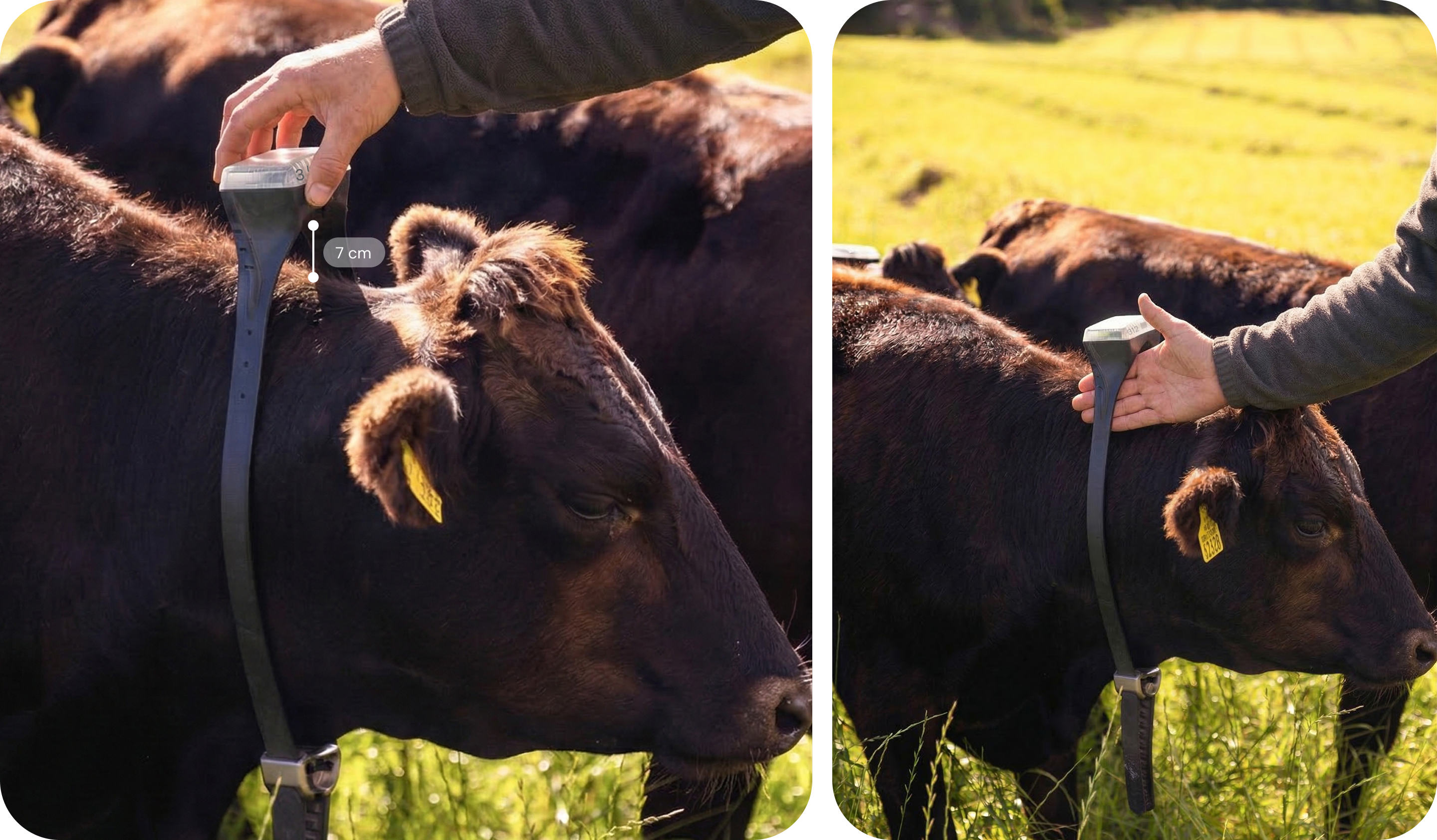 Sjekk at klaven er riktig montert ved Γ₯ ta tak i den elektroniske enheten og plasser en hΓ₯nd pΓ₯ hΓΈykant inn mellom klaven og dyrets nakke.