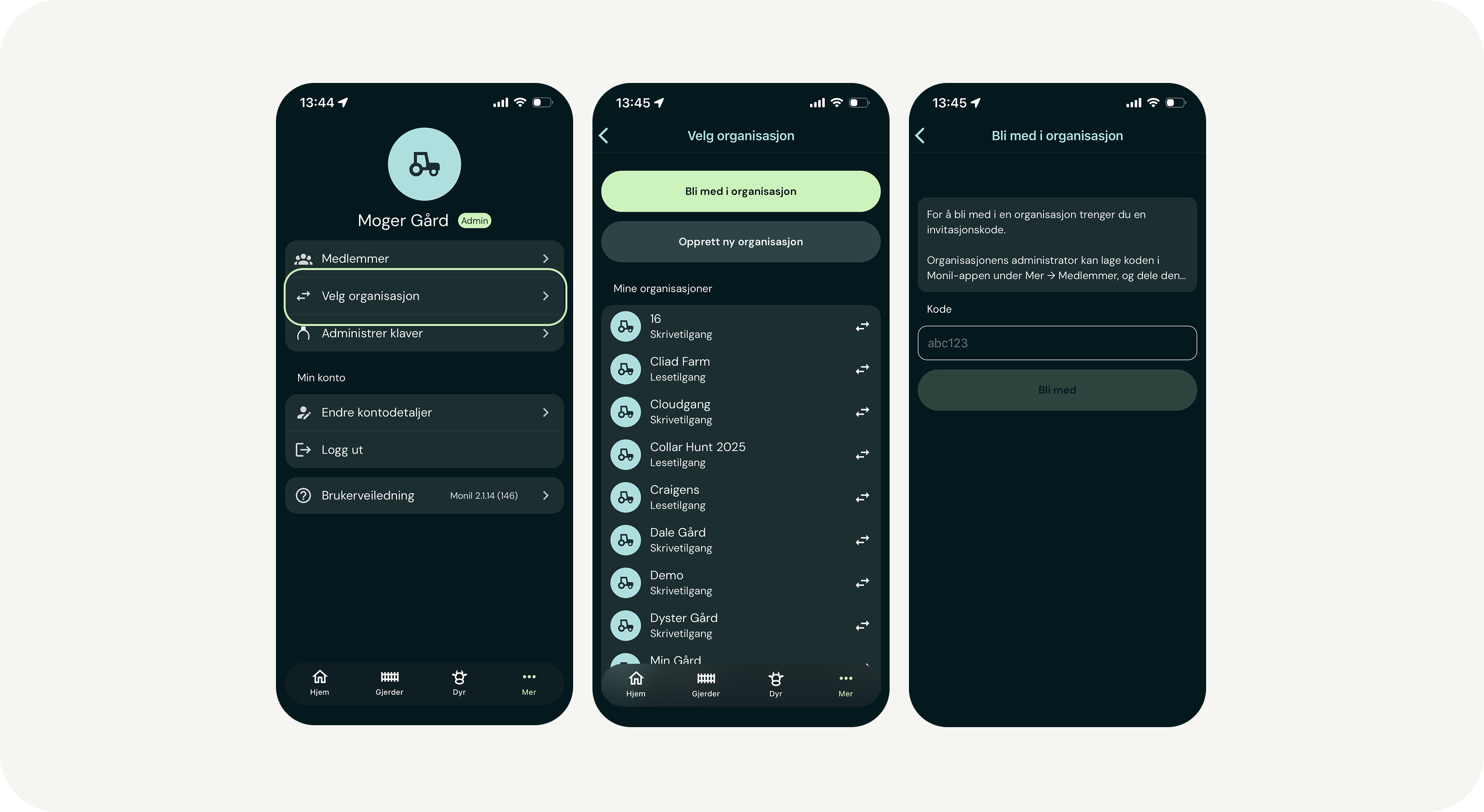 - Den nye brukeren går inn i sin app og trykker “Mer” -> “Velg organisasjon” og “Bruk invitasjon”. Her skrives koden inn.