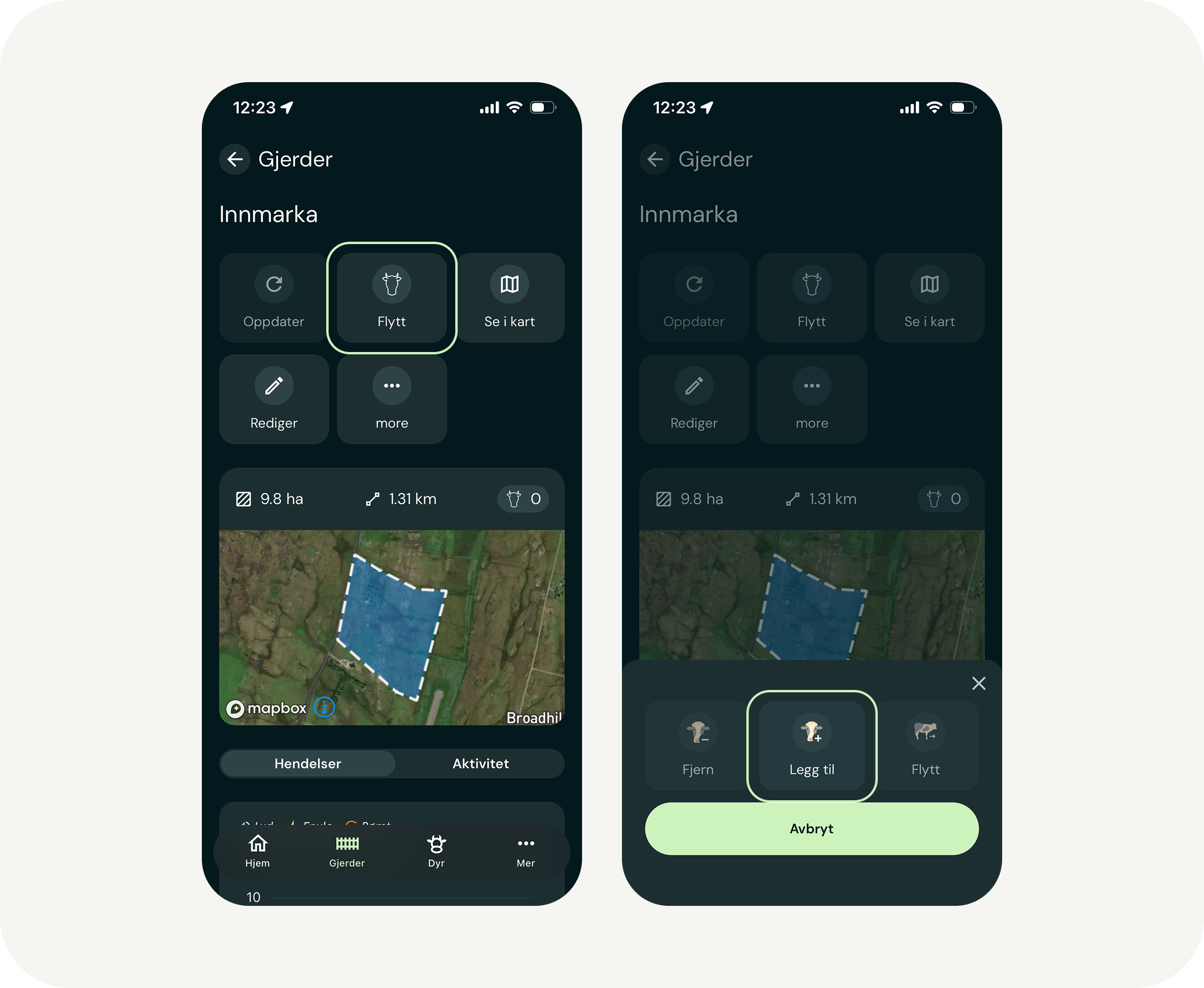 Etter at du har tegnet opp det virtuelle gjerdet i appen, trykker du på “Flytt“ inne på det spesifikke gjerdet. Du får opp valgene:
