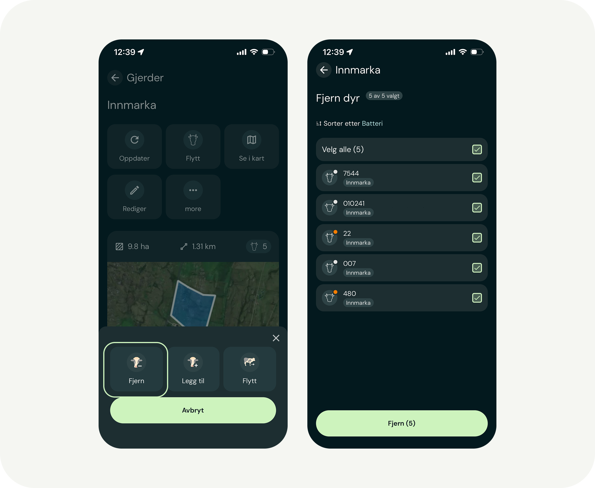 Du deaktiverer gjerdet ved å fjerne dyr fra gjerdet i appen, eller ved å flytte dem direkte til et nytt gjerde.