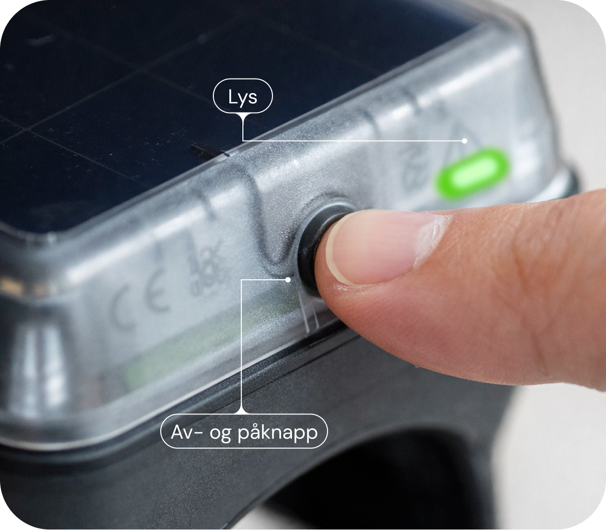 For å skru på klaven holder du inne knappen som er på baksiden. Når lyset på klaven blinker grønt to ganger er klaven påskrudd.