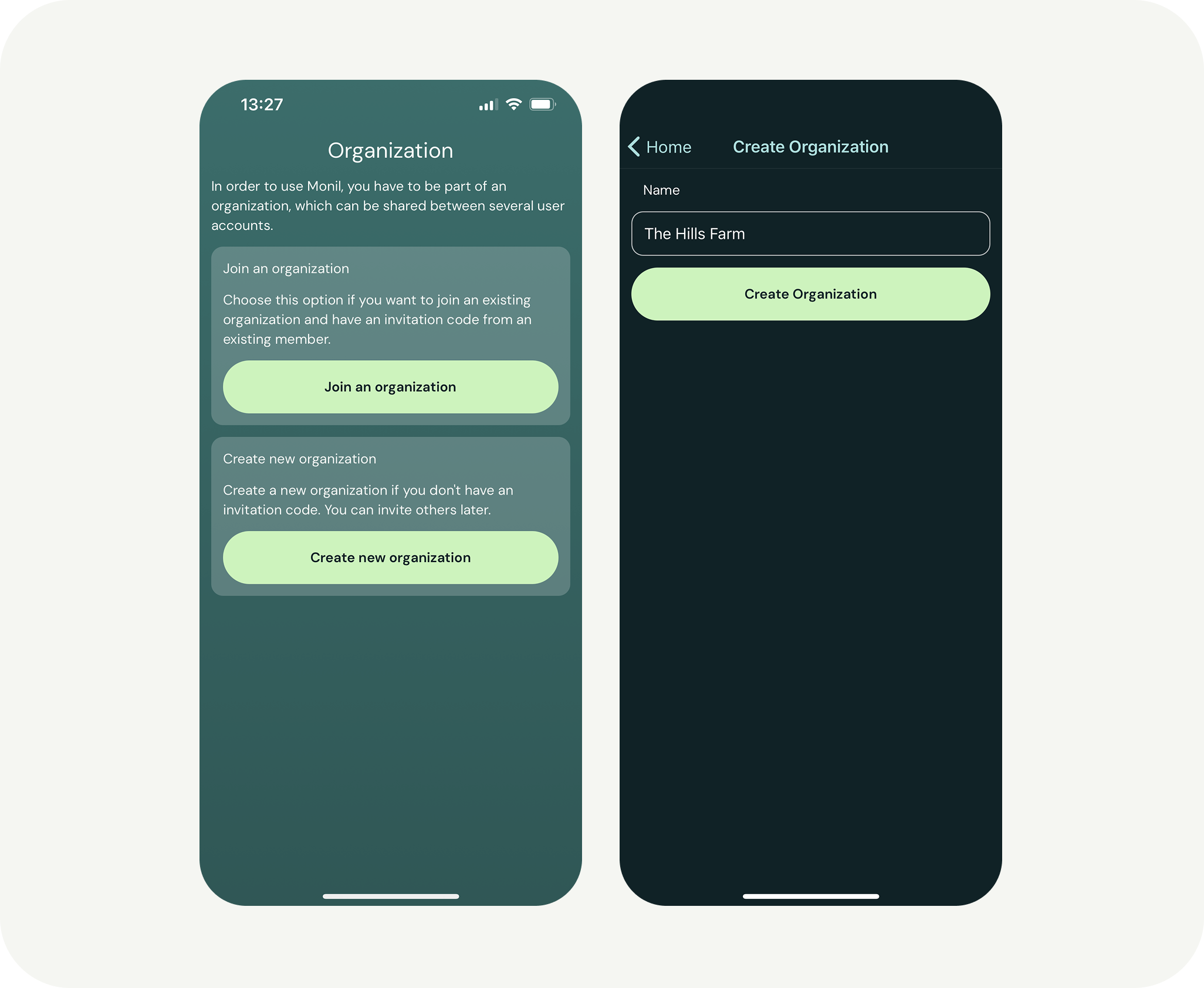 If you create your own organization, you can set the name to be the same as your farm’s name. If you’re joining an organization that already exists, the administrator of that organization needs to send you an invitation code. This is done in the app under “More” and then “Members.”